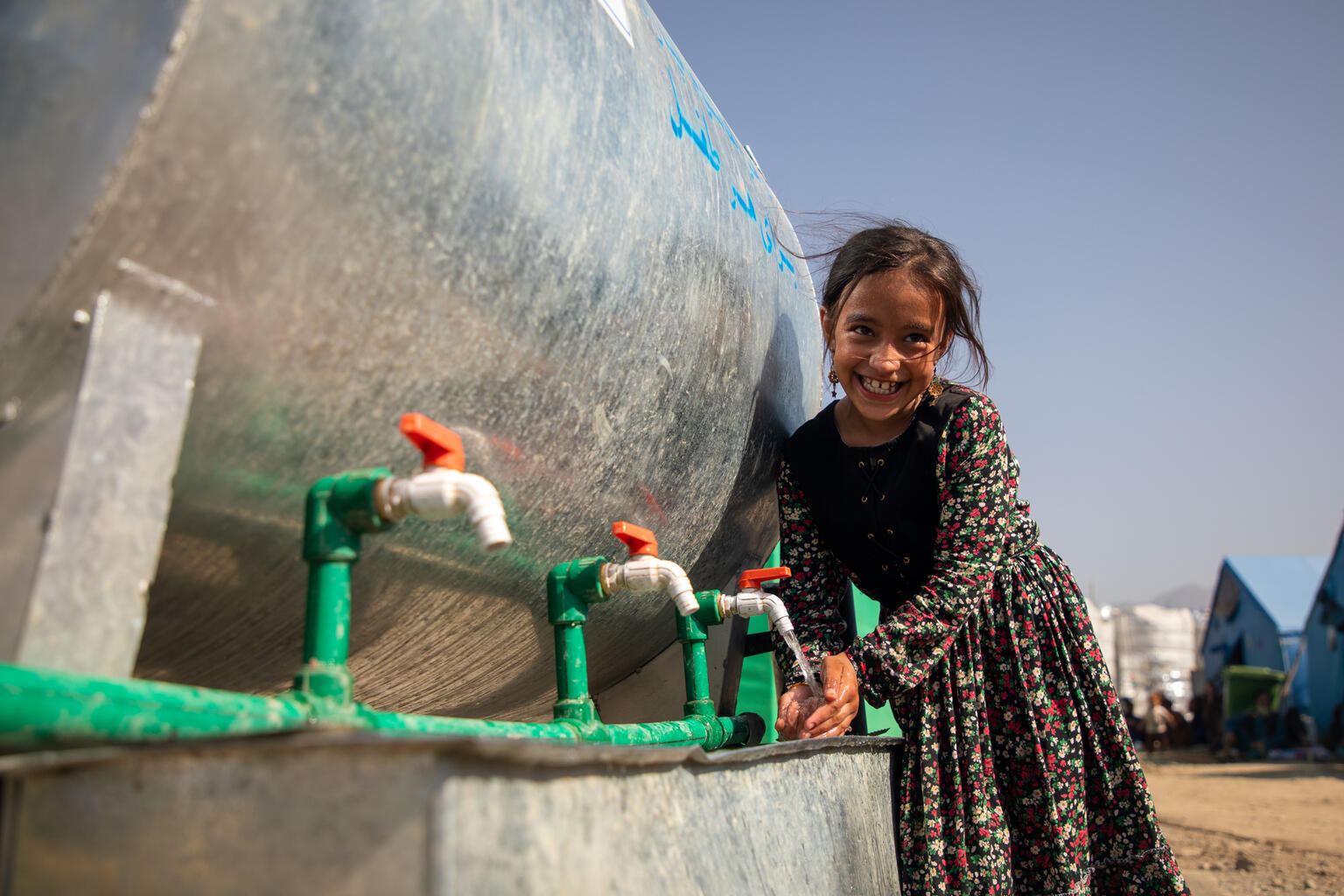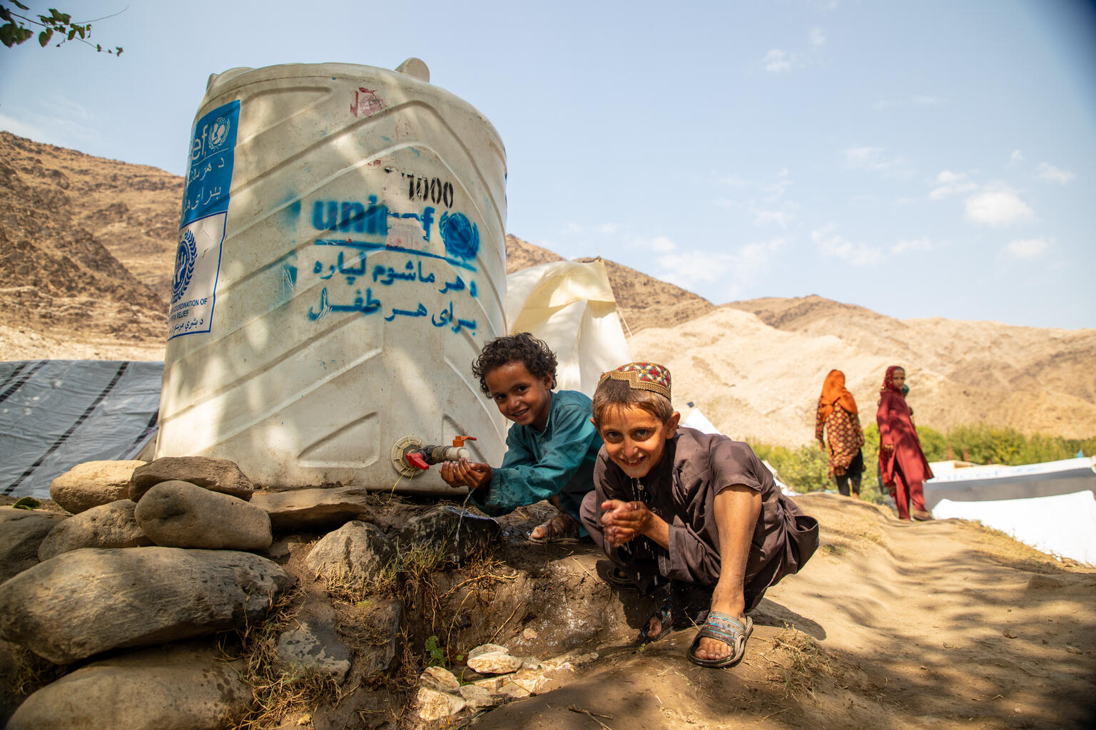 A Sawki Zor Kali táborban élők alapvető szükségleteit is biztosítjuk az UNICEF támogatóinak köszönhetően. Így a képen látható Khetab és Hanzala is tiszta vízhez juthat.