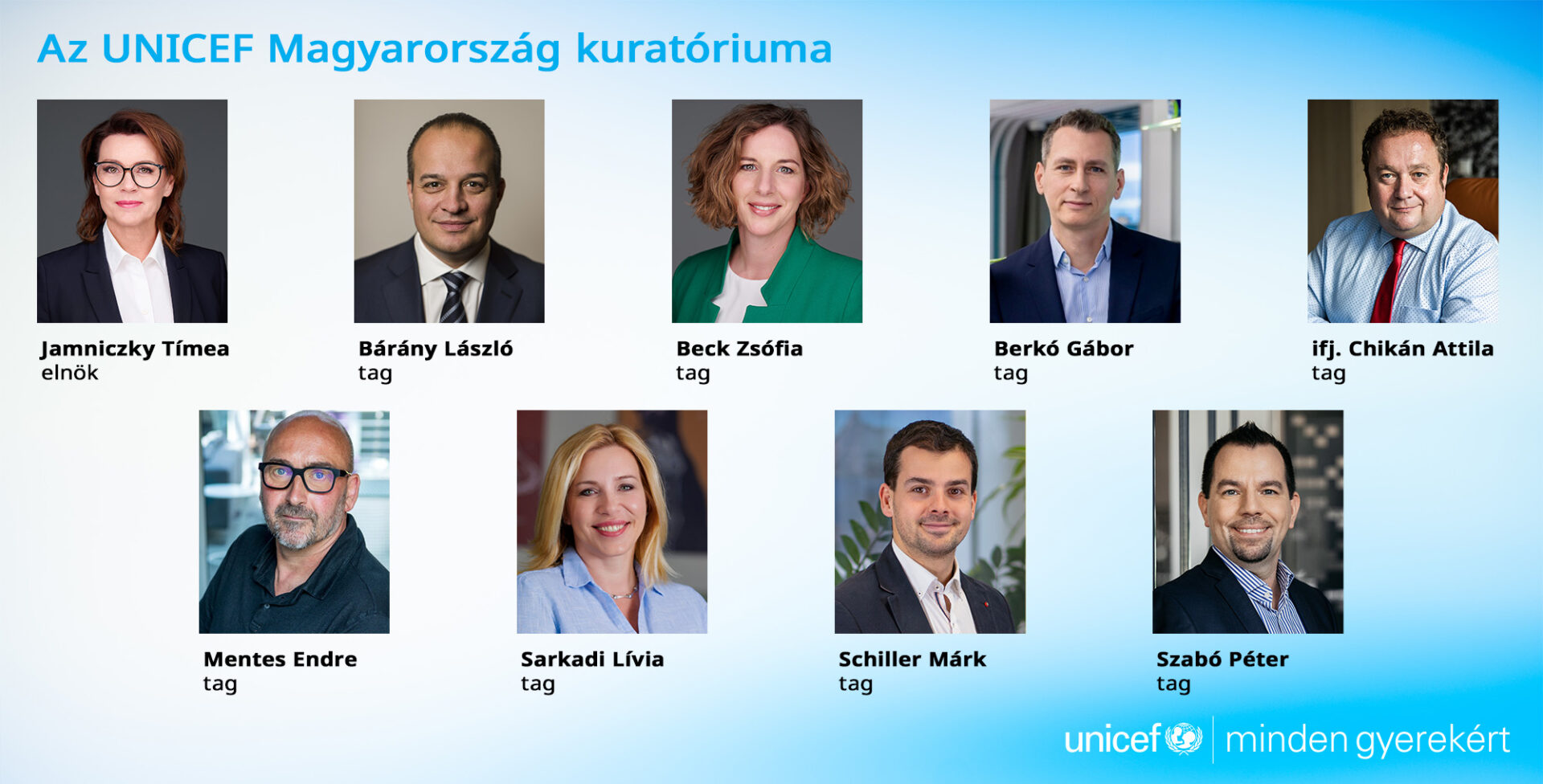 - Jamniczky Tímea, a JCDecaux Hungary Zrt. vezérigazgatója, több mint tíz éve támogatja az UNICEF Magyarország munkáját a kuratórium elnökeként. A hazai és nemzetközi marketing és média szektor egyik legismertebb női vezetője, számos rangos szakmai díj kitüntetettje.