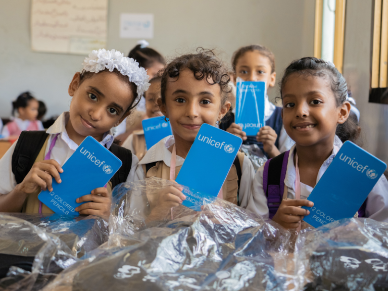 Ahlam Hani, 11 éves jemeni kislány is egyike azoknak, akik az UNICEF-től kaptak új tanszereket: