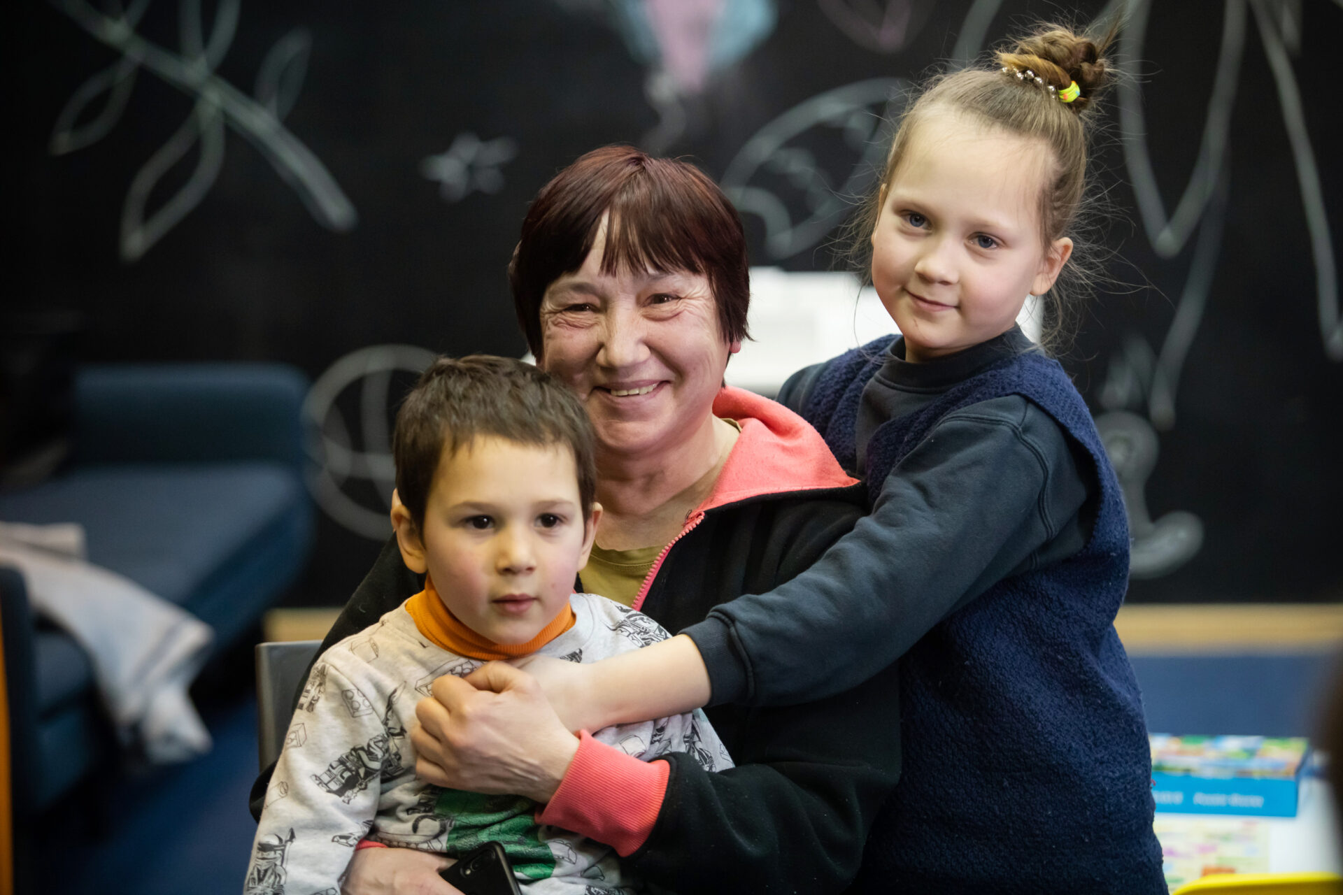 A 8 éves Liza és húga, a 4 éves Illia nagymamájukkal, Svitlanaval játszanak a gyermekbarát központban a kijevi vasútállomáson.