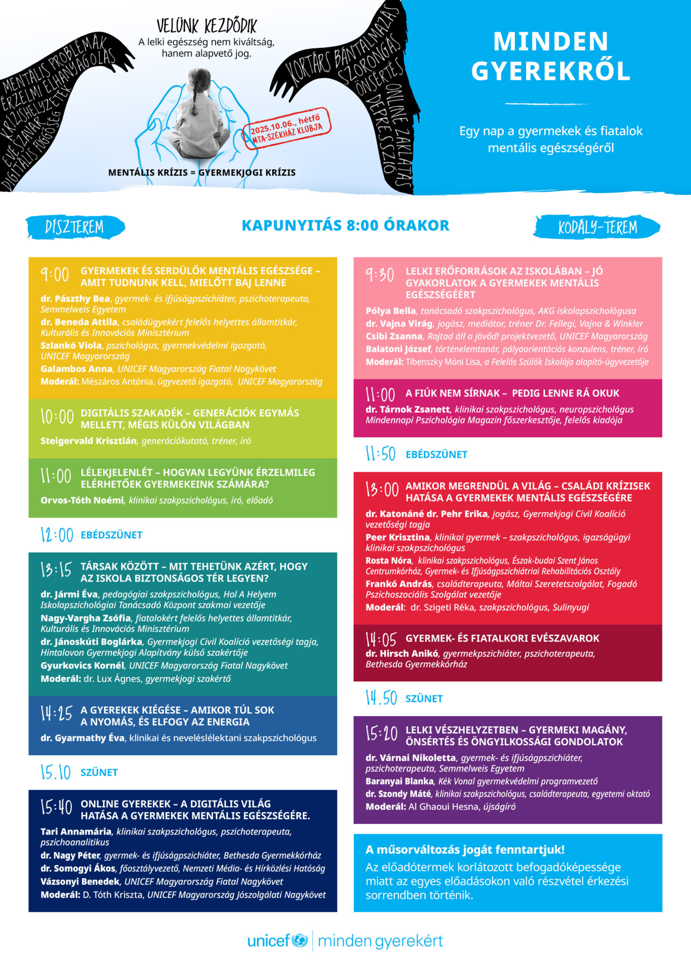 Ezért az UNICEF Magyarország 2025. október 6-án, a mentális egészség világnapjához kapcsolódva egész napos konferenciát szervez az MTA-székház klubjában, ahol a gyermekek és fiatalok lelki jólléte kerül a középpontba.